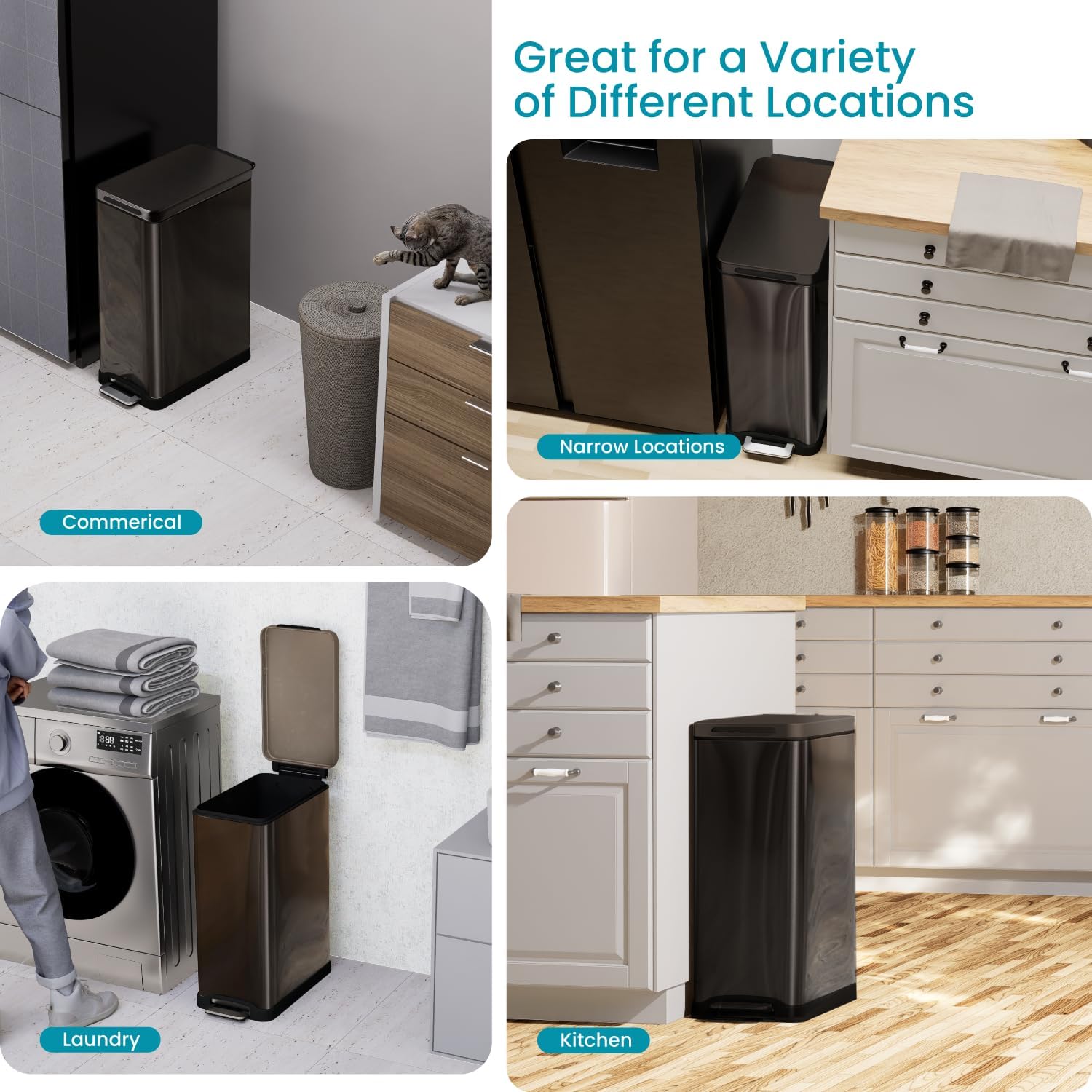 Home Zone Living 12 Gallon Slim Kitchen Trash Can with Soft Close Lid, Step Pedal, Bag Tuck Band, and Removable Liner, Stainless Steel, Black, 45 Liters